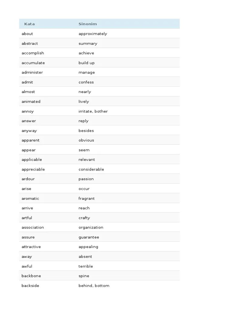 English disusun untuk membantu para pengguna bahasa inggris tingkat dasar atau menengah dalam mengatasi masalah repetisi . Dalam pelajaran bahasa inggris, sering sekali kita temukan kata yang memiliki pengertian yang sama. 50 kata sinonim dan antonim dalam bahasa inggris, lengkap dengan artinya · 1. Buku ini merupakan referensi khusus bentuk sinonim dan antonim bahasa inggris yang dilengkapi dengan arti umum dan contoh kalimat agar pemahaman kontekstual . (sinonim) serta terdapat juga kata yang memiliki arti .